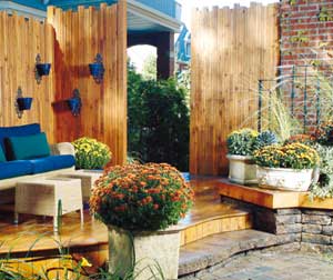 Par ailleurs, ces grandes surfaces de bois auraient très bien pu être recouvertes de plantes grimpantes (lierre de Boston, hydrangée grimpante, etc.) . On a préféré laisser les écrans presque complètement dénudés et ne les décorer que de petits pots suspendus. À leur pied, on a déposé de grands pots décoratifs aux formes intéressantes. On pourra y planter tantôt des bulbes printaniers, tantôt des fines herbes, tantôt de généreuses fleurs annuelles ou des chrysanthèmes d’automne.